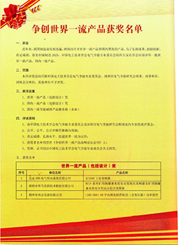 2015年11月27日由中國電工技術(shù)學(xué)會電氣節(jié)能專業(yè)委員會聯(lián)合中國歐洲經(jīng)濟技術(shù)合作協(xié)會共同主辦的 “爭創(chuàng)世界一流產(chǎn)品高峰論壇”會議在深圳召開。北京ABB電氣傳動系統(tǒng)有限公司ACS880系列工業(yè)變頻器和深圳市庫馬克新技術(shù)股份有限公司生產(chǎn)的BPJV系列礦用隔爆兼本質(zhì)安全型高壓變頻器及礦用隔爆兼本質(zhì)安全型高壓組合變頻器等。分別獲得世界一流產(chǎn)品(設(shè)計)獎。