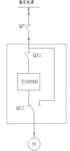 一拖一手動旁路柜包含兩個隔離刀閘QS1、QS2及相關(guān)保護電機設(shè)備。正常運行時,變頻器拖動電機運行,當(dāng)變頻出現(xiàn)故障時,可斷開電機變頻控制回路,合閘工頻回路,即可保持生產(chǎn)持續(xù)運行;旁路柜中QS1、QS互鎖,當(dāng)QS1合閘時,QS2不能合閘至工頻側(cè),保證電路回路操作安全、可靠。